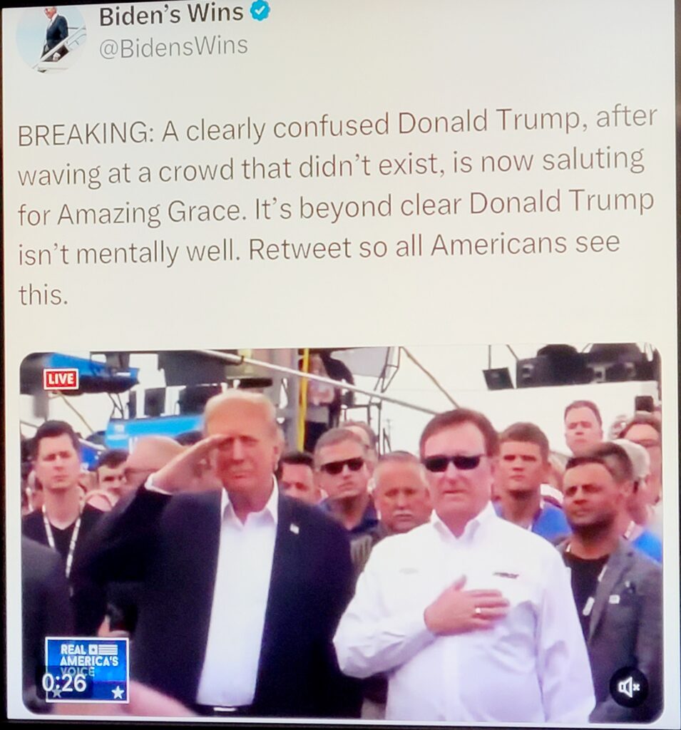 At the start of the race, they played the song ‘Amazing Grace’. For some reason, demented, deranged Donny thought this was some kind of national anthem and he saluted throughout the entire song. This is just another example of how disconnected he is with reality.